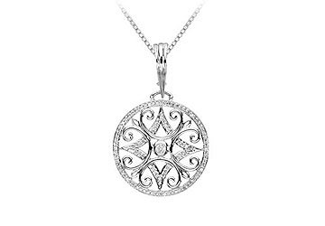 Brilliant-cut smaller round diamonds made a circle and inside beautifully design in this 14K white gold with center a single bezel-set round diamond. This gorgeous enhancer pendant has a total weight (TDW) of 0.65 carat and comes with standard 16" 14K white gold chain.