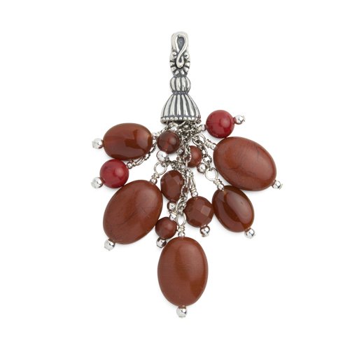Polished coral, carnelian and red jasper gemstones form a tasseled bouquet for a lady in red. A symphony in warm and colorful reds, this bail is a perfect finishing touch for its matching necklace (B0026KGTSE). Carnelian was once used in signet rings and Poseidon was said to live in a palace of coral and gems. Red jasper is considered a calming and stabilizing stone. Clip on fastener makes it easy to add or remove this bail. This CP Signature item measures approximately 3" L x 1-1/4" W. Proudly made in New Mexico, USA with fair labor. We do our part for the environment by handcrafting our jewelry from recycled genuine sterling silver.