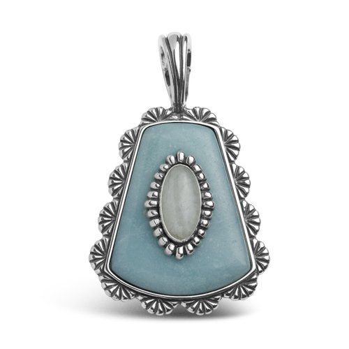 Revel in the cool shades of a tropical sea! Aquamarine is the gemstone of the sea. Sailors traveled with it to ensure a successful voyage and guarantee a safe return home, they slept with it under their pillows for sound sleep, and they believed the lower half of the sirens, or mermaids, were made from its crystals. In this striking hinge-bail enhancer, milky aquamarine is presented in a tribute to the magical life of the ocean, setting it on the backdrop of a trapezoidal piece of polished amazonite. Enhancer measures 2-1/8" L x 1-3/8" W and is framed in sterling silver detailed with sunray scrollwork. Proudly made in New Mexico, USA with fair labor. We do our part for the environment by crafting our jewelry from recycled genuine sterling silver.