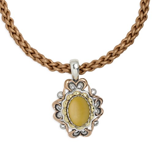 Celebrated designer Carolyn Pollack combines stunning modern design with old world elegance in a piece sure to garner second looks! A bold yellow jasper cabochon is framed in genuine copper, brass, and sterling silver. The enhancer dangles from a braided metallic leather cord, but the convenient snap hinge bail means it can be worn on a favorite chain as well. Necklace is adjustable 17" to 21" L. Proudly made in New Mexico, USA with fair labor. We do our part for the environment by handcrafting our jewelry from recycled genuine sterling silver.