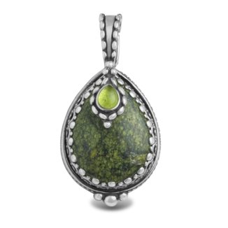 An abundance of silver and striking green make this enhancer a must for any goddess's collection. A pear-shaped peridot shines royally at the crown of a serpentine cabochon, adding a fresh and lovely contrast to the serpentine's lush, layered green. A beaded sterling border adds a touch of pure elegance. Enhancer measures 2" L x 1" W and features a snap hinge bail. Proudly made in New Mexico, USA with fair labor. We do our part for the environment by handcrafting our jewelry from recycled genuine sterling silver.
