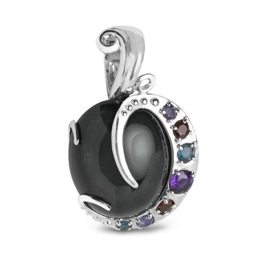 Award-winning moonlit magic from renowned designer Carolyn Pollack will add some sparkle to your wardrobe! With all the hopeful expectation a new desert moon brings, this black rainbow obsidian enhancer shimmers like a bejeweled dream. Representing the tremendous good fortunes within your grasp, the black oval stone is embraced by a sparkling series of amethyst, blue topaz, garnet, and iolite gemstones. A twisting frame of sterling silver entwines with the natural obsidian cabochon and coils into a snap hinge bail. This one-of-a-kind enhancer measures 1-7/8" L x 1-1/4" W. Proudly made in New Mexico, USA with fair labor. We do our part for the environment by crafting our jewelry from recycled genuine .925 sterling silver.