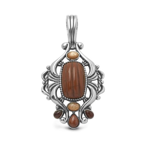 This dramatic natural gemstone and sterling silver enhancer has it all! Decorated with an assortment of spicy red gems, featuring a large, rectangular red jasper cabochon surrounded by oval orange sunstones, tear-drop-shaped red jasper, and rich carnelian stones, this eye-popper will turn up the heat and ignite your days and nights! The framework of the pendant is a gorgeous scallop and rib design made from genuine sterling silver with an oxidized and antique finish. Measures 2-7/8" L x 1-1/2" W and features a large, ribbed snap hinge bail. Proudly made in New Mexico, USA with fair labor. We do our part for the environment by handcrafting our jewelry from recycled genuine sterling silver.