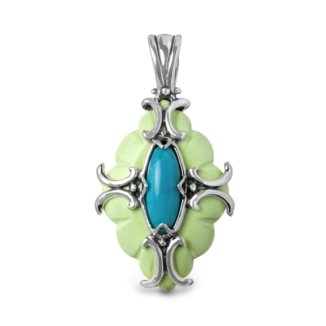 Recall the cool breeze of a summer afternoon every time you wear this refreshing gemstone and sterling silver enhancer! The crisp lemony shade of a yellow-green magnesite scalloped cabochon and the tranquil blue of an oval turquoise stone combine for a revitalizing style that will brighten your every outfit. Overlaid with an ornamental openwork design of sterling silver, this sculptural enhancer is a lasting tribute to sunshine and serenity. Measures 2-3/4" L x 1-1/2" W and features a large sterling silver snap hinge bail. Proudly made in New Mexico, USA with fair labor. We do our part for the environment by crafting our jewelry from recycled genuine sterling silver.