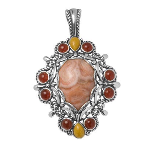 A cabochon of dyed orange crazy lace agate is surrounded by sterling silver in a scalloped design. Orange carnelian (heat-treated to enhance color) and yellow jasper stones around the outside of the silver add an extra pop of color for a look you'll love. Measures 2-1/2" long x 1-3/4" wide with a snap hinge bail. Proudly made in New Mexico, USA with fair labor. We do our part for the environment by crafting our jewelry from recycled genuine .925 sterling silver.